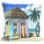 Bring coastal style to your patio with the Beach Hut Indoor/Outdoor Pillow. This indoor/outdoor pillow has a colorful seaside depiction of a beach hut and surfboards facing the rolling surf.