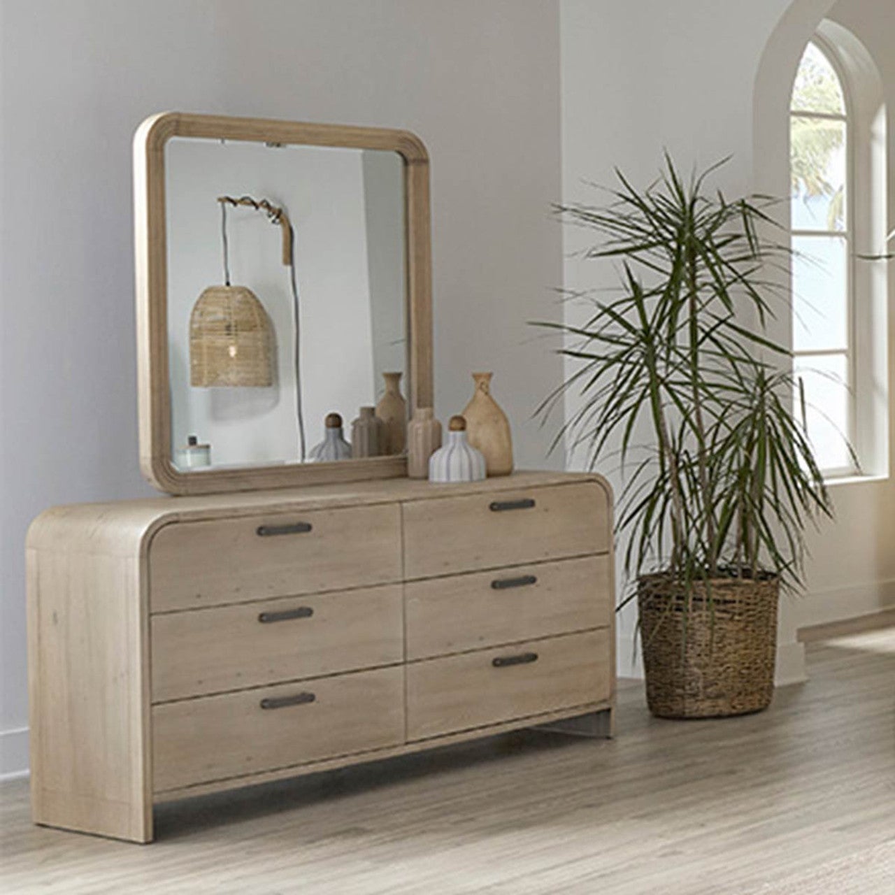 Accented by soft, rounded edges, this collection brings modern casual style to your coastal bedroom. The bed is upholstered in a durable boucle performance fabric, and the drawers feature antique brass pulls.