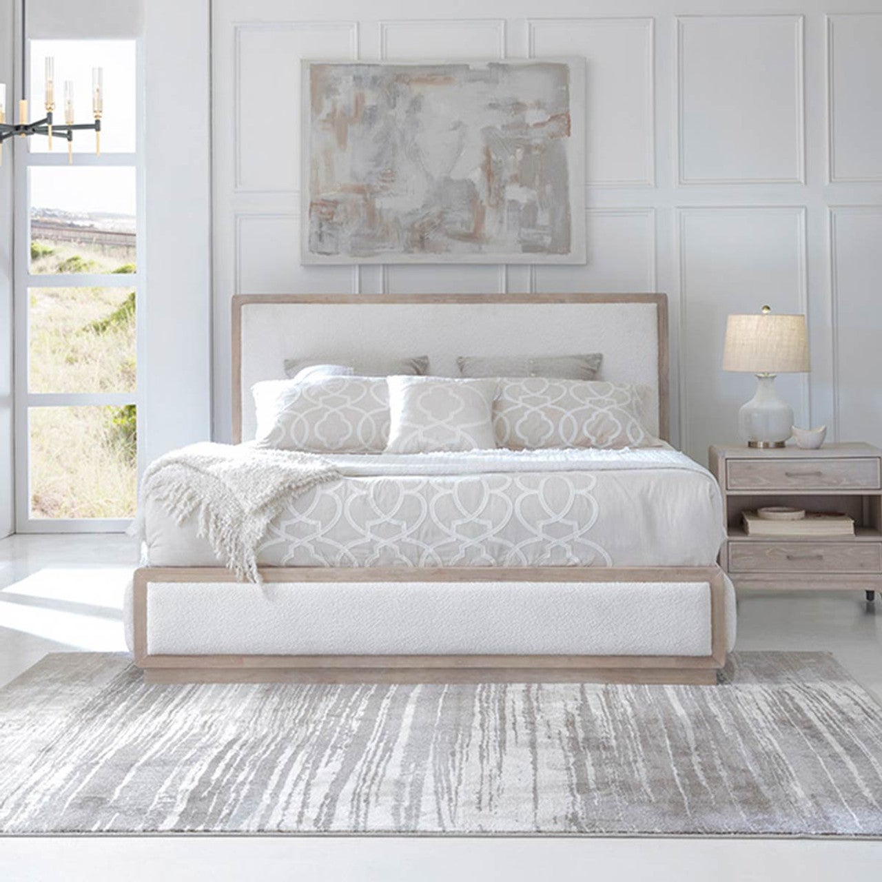 This elegant collection features warm natural oak veneer with a wire-brushed finish for a harmonious and refined aesthetic. The beds feature elegant, textured ivory boucle performance fabric on the headboard, footboard and the siderails, that exude sophistication and style.
